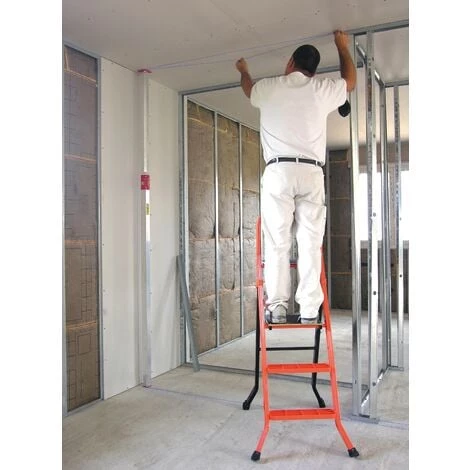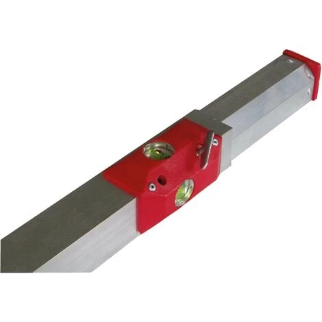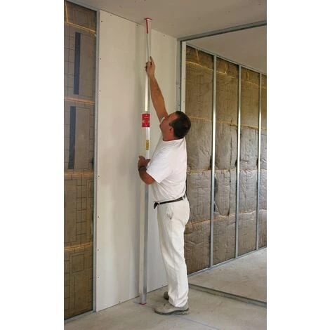 Pour le traçage et l’implantation des cloisons. Cette règle extensible avec niveaux verticaux permet le report simple et rapide du tracé du sol au plafond par une seule personne. A l’extrémité supérieure de la règle peuvent s’adapter deux platines amovibles, une pour un report de tracé normal, l’autre pour un report décalé. Le pied muni d’un ressort, et un papillon de blocage permettent de fixer la règle entre sol et plafond. Dans le cas de cloison alvéolée, utiliser la platine déportée de 10 ou 13 mm selon l’épaisseur de la plaque de parement (voir schéma). Une oreille permettant d’accrocher un cordeau-traceur facilite le traçage par une seule personne.
